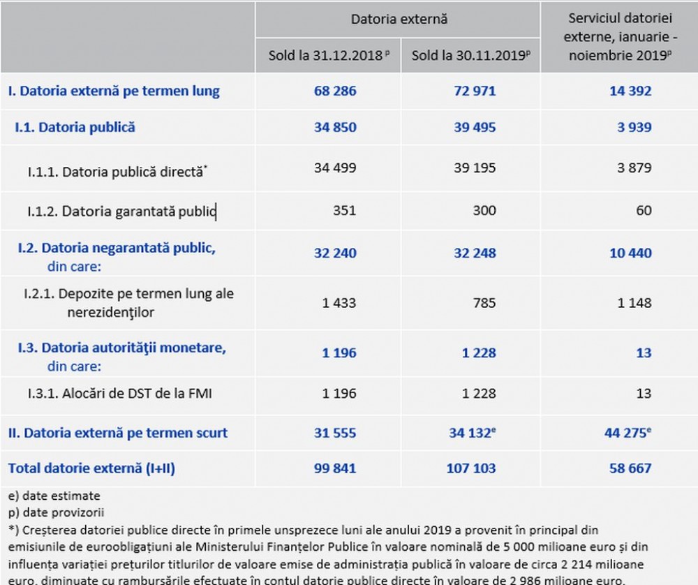 Creșterea accelerată a datoriei externe a româniei. În 31 decembrie 2018, datoria externă totală era de 99,841 . Totalul datoriei externe, în creștere cu 6,5% față de 31 decembrie 2018. Datoria externă totală a româniei a crescut cu 9131 miliarde euro, în primele. România a terminat anul 2019 cu o datorie externă totală de 106.